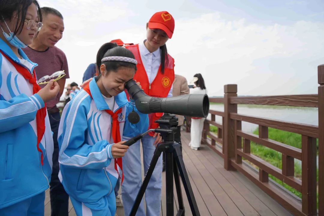 第一站,同学们来到了梁子湖观鸟站,在工作人员的指导下,同学们通过望远镜看到了天鹅、大雁等各类候鸟,并学会了通过观察它们的不同特征来分辨各种鸟类。