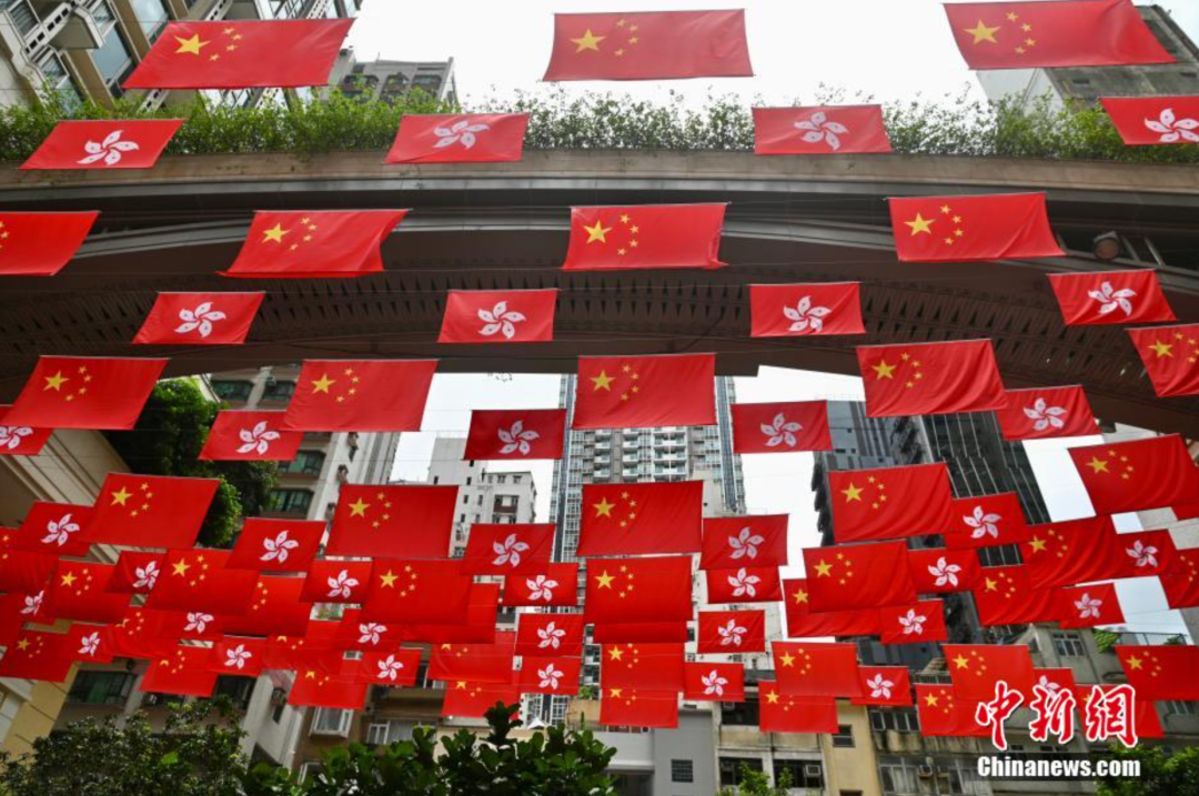 大街小巷国旗、区旗飘扬,渔船挂上庆回归标语在维港巡游,行人天桥挂满大红灯笼,多地建筑亮起灯光……