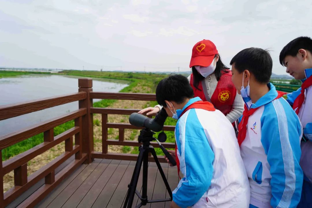 第一站,同学们来到了梁子湖观鸟站,在工作人员的指导下,同学们通过望远镜看到了天鹅、大雁等各类候鸟,并学会了通过观察它们的不同特征来分辨各种鸟类。