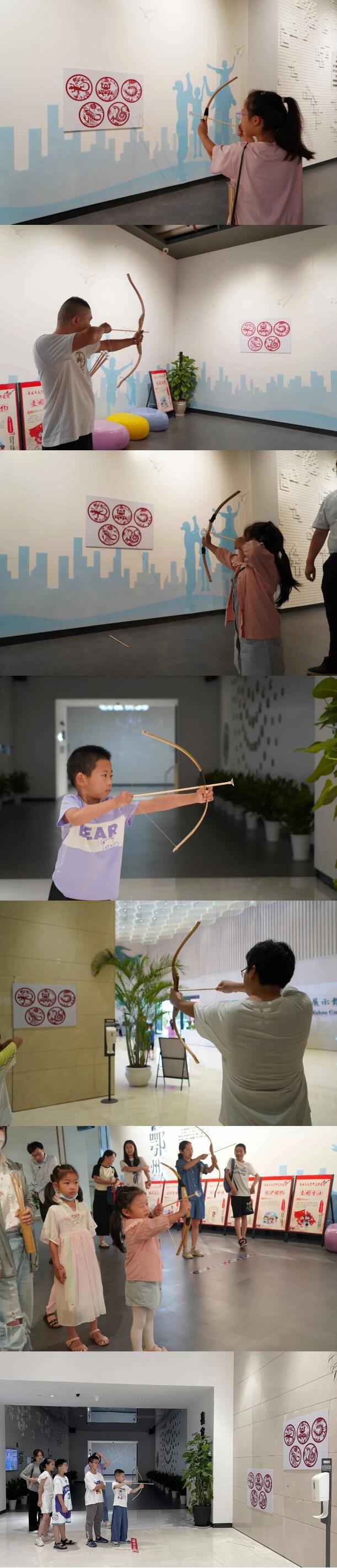 端午节有项习俗是射五毒,把五毒(蛇、蝎、蜈蚣、壁虎、蟾蜍)的画像做成靶子,通过弓箭投射五毒,寓意无病无灾。市民游客们在工作人员的引导下,有序排队,玩起了箭射五毒的游戏,大家卯足力气,争取游戏的胜利,现场一片欢声笑语。