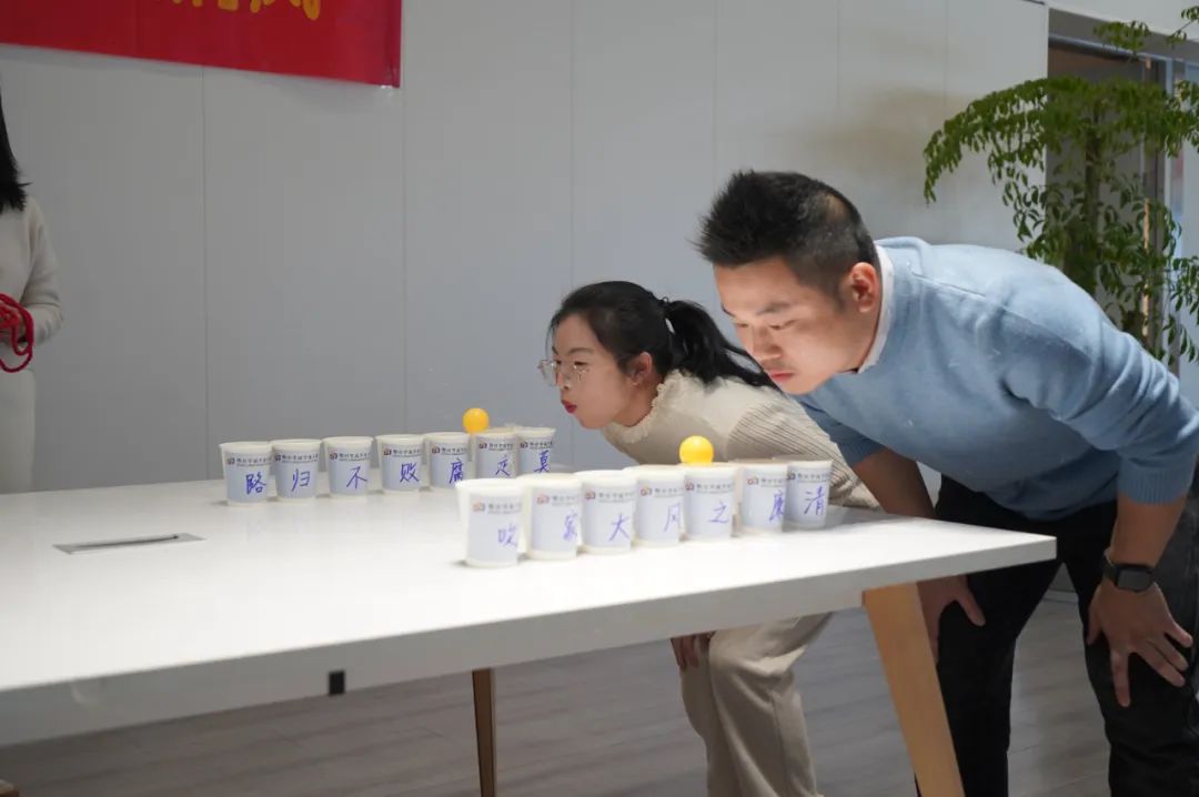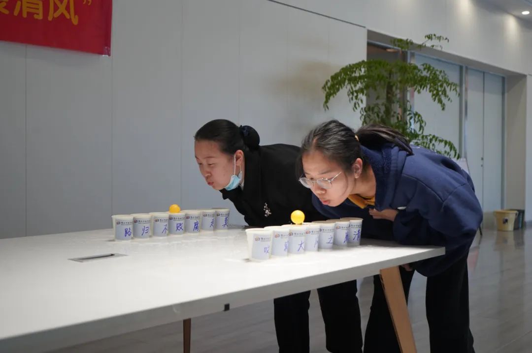 在“清廉风,大家吹”的游戏环节中,需要参与者通过巧劲将乒乓球吹入象征“廉洁”的杯内。